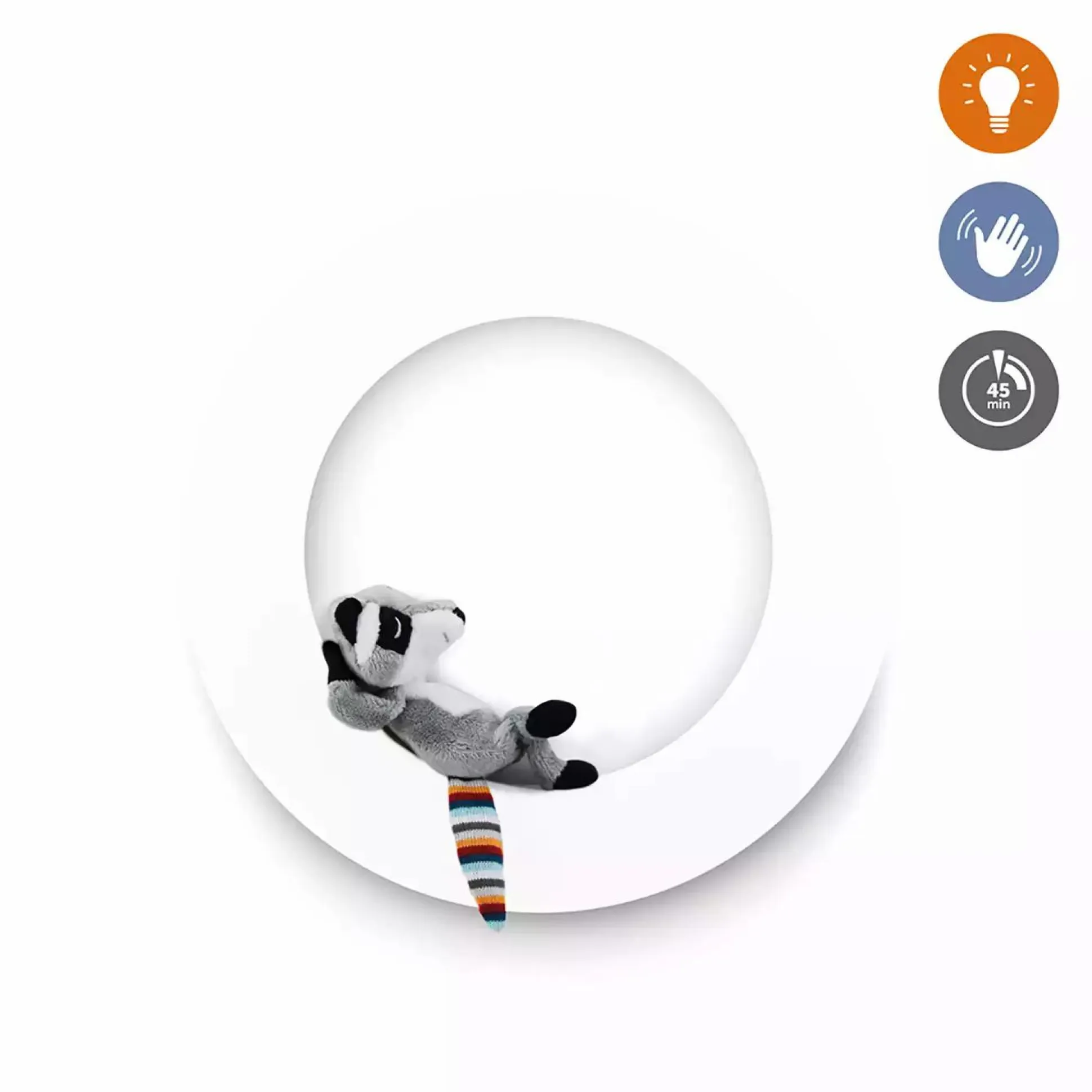 Das hübsche Wandlicht mit automatischer Ausschaltung und Geräuschsensor schafft eine beruhigende Atmosphäre in jedem Kinderzimmer. Rex, der süße Waschbar kann an die Lampe angebracht werden. Durch Handbewegungen kannst du das Wandlicht bedienen, ohne Knöpfe zu betätigen. Du kannst zwischen mehreren Farben wählen und die Helligkeit vollständig anpassen. Egal ob das Wandlicht Rex nach ca. 45 Minuten automatisch ausgeschaltet werden oder die ganze Nacht leuchten soll, ie zwei Funktionen lassen sich ganz einfach bedienen.