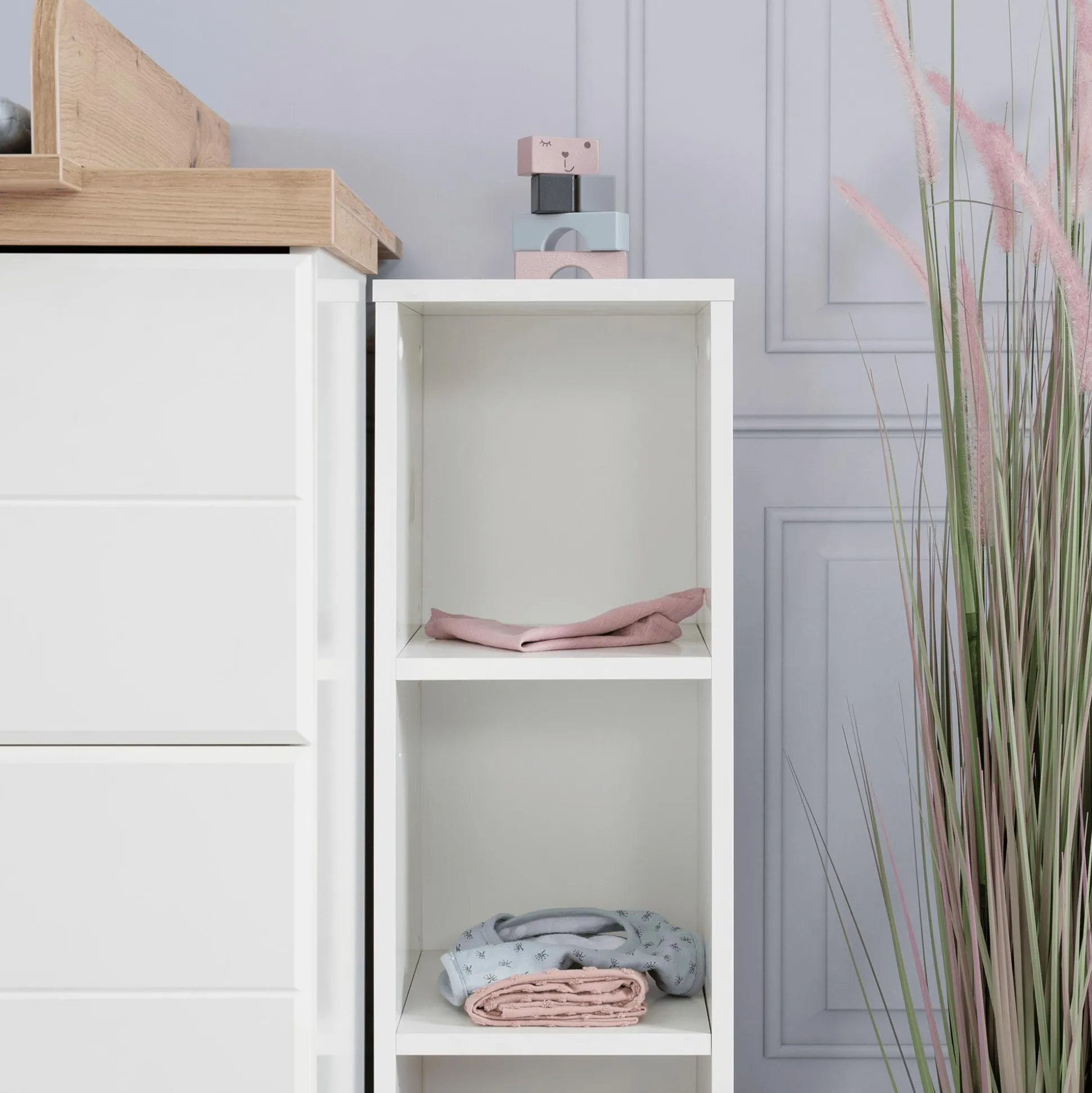 Das Seitenregal im modernen und zeitlosen Dekor ist speziell konzipiert und lässt sich leicht unter den Wickelansatz schieben und beugt so der Platzverschwendung effektiv vor. So ist Wickelzubehör immer griffbereit und ideal hierbei für Babyhygiene-Produkte wie Windeln, Puder und Öle geeignet. Aber auch als kleines freistehendes Regal bezaubert das Möbelstück in jedem Kinder- und Babyzimmer.