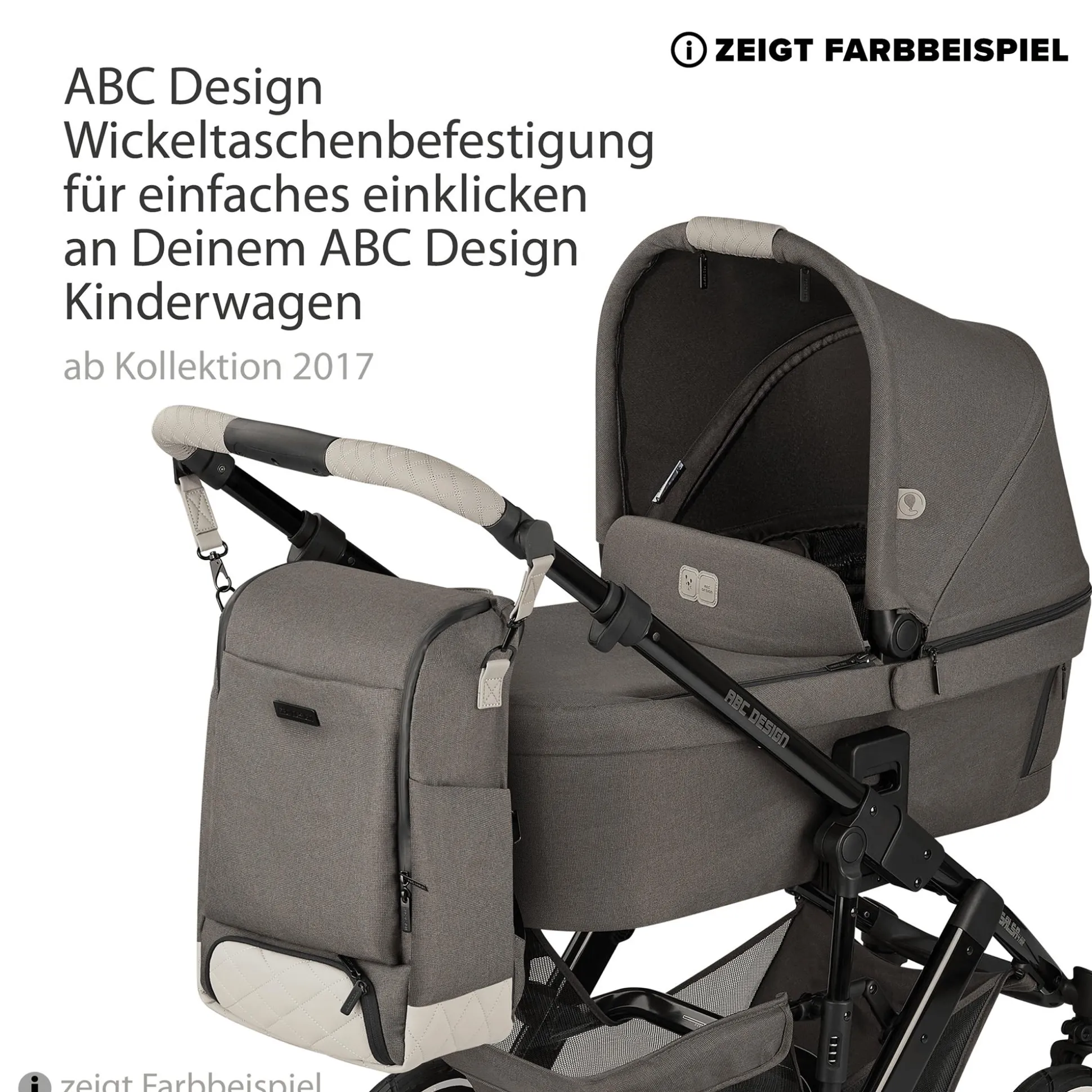 - kann mittels Universal-Halterungen einfach und schnell an alle ABC Design Kinderwagen-Modelle angebracht werden