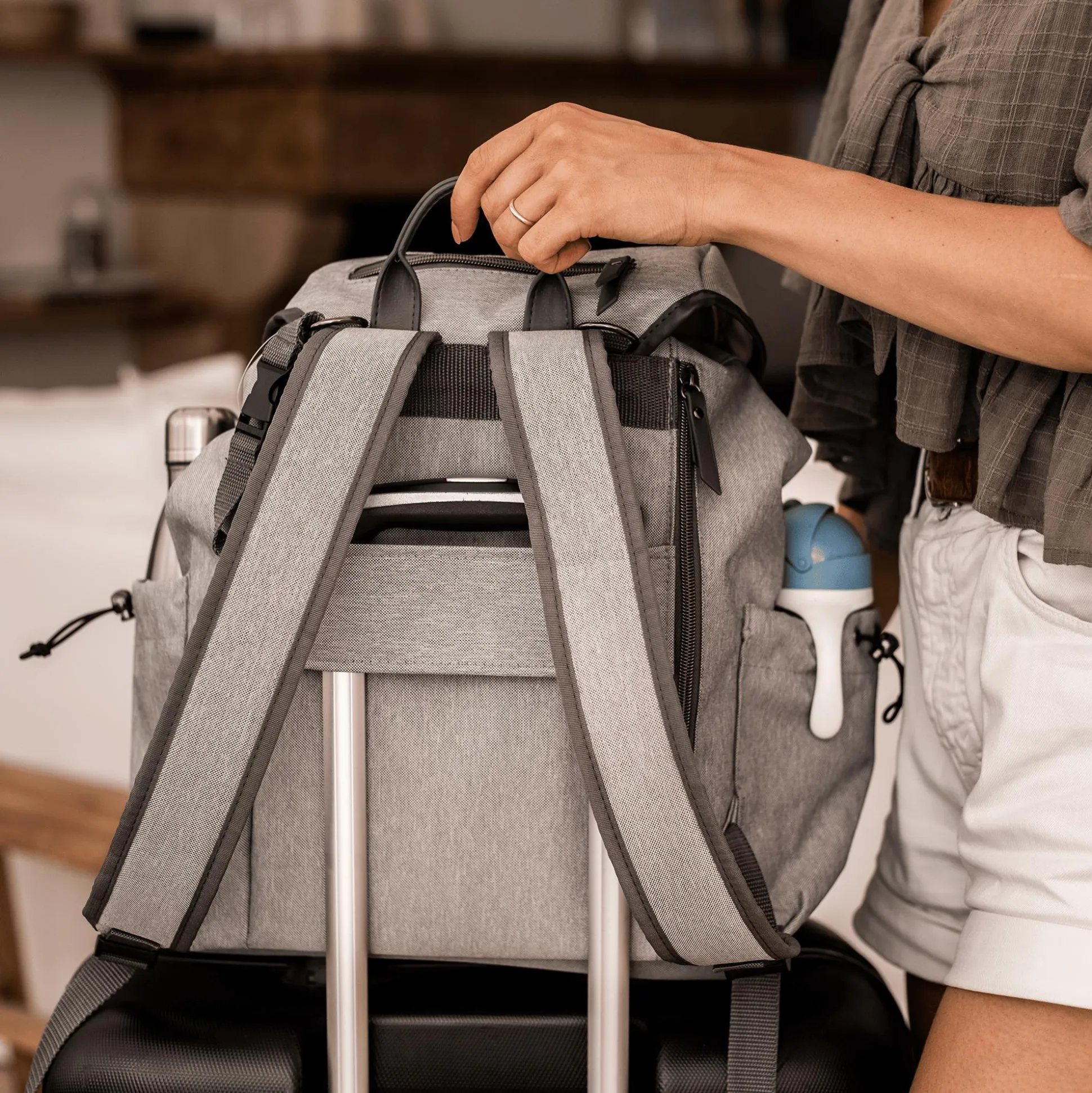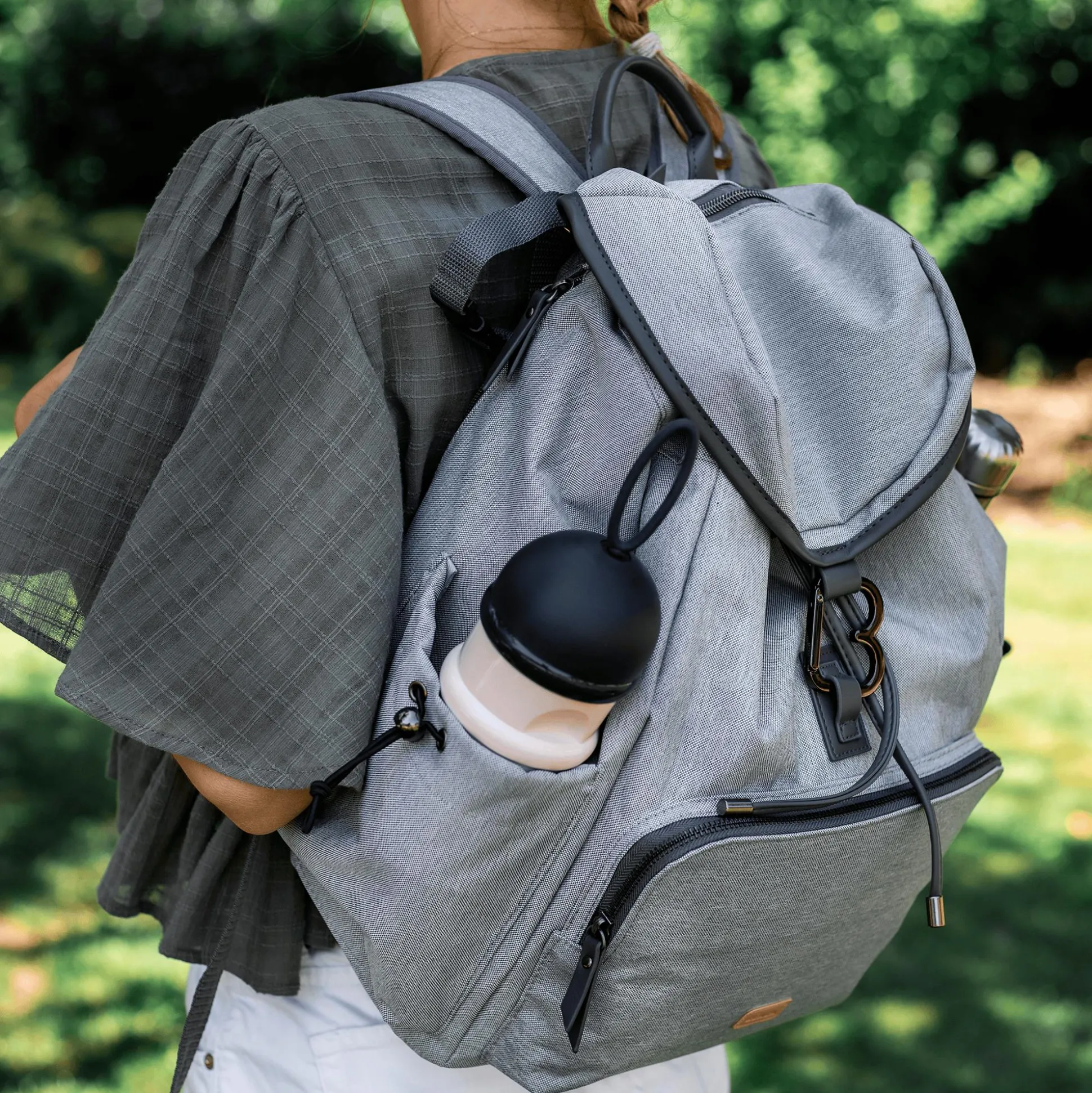Der hellgraue Wickelrucksack Vancouver von Béaba mit gepolsterten Schultergurten und Rückenverstärkung macht auf dem Rücken sowie am Kinderwagen eine gute Figur.