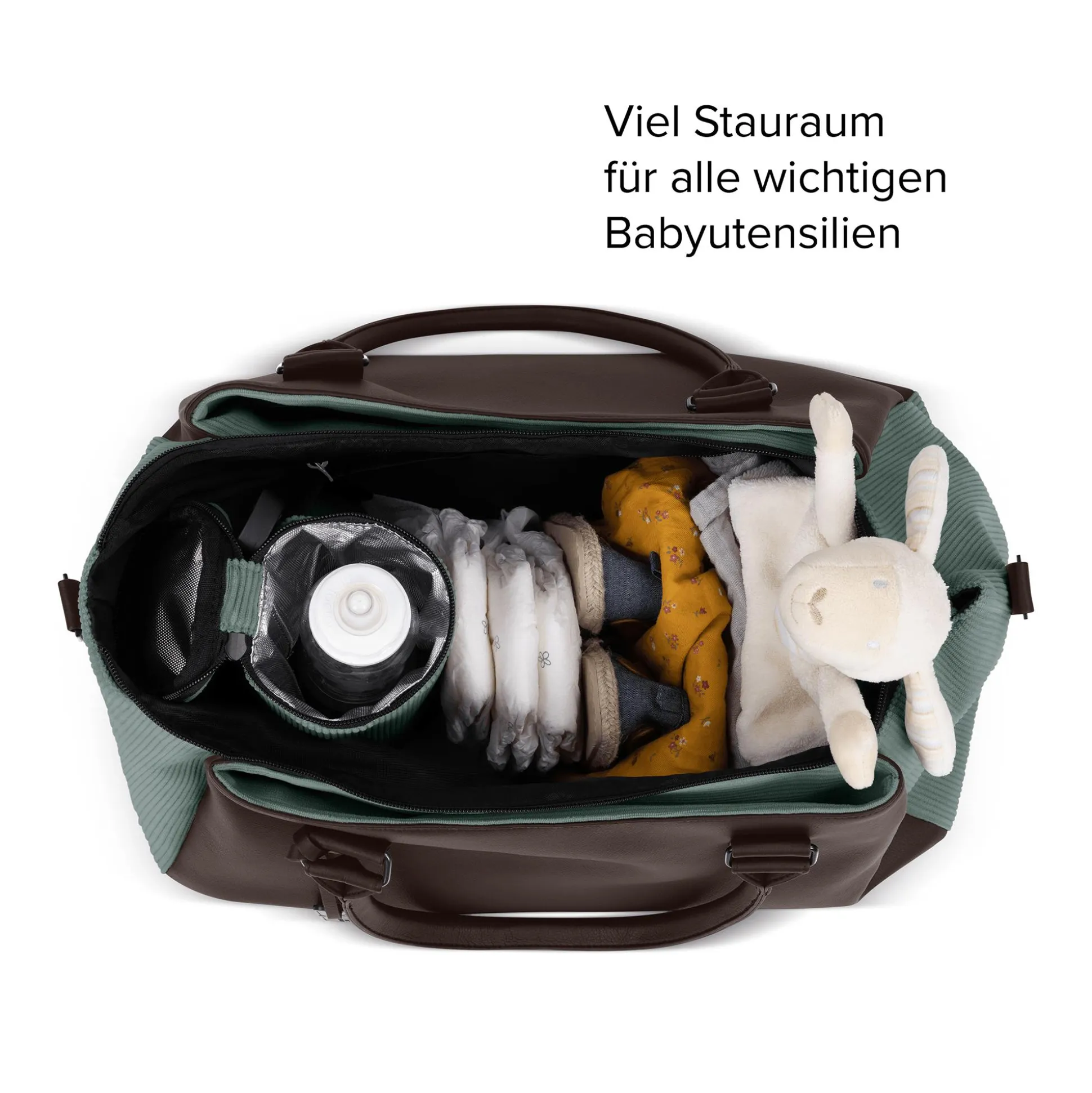 Damit noch nicht genug – integriert sind zudem eine hygienische Wickelunterlage, ein isolierter, herausnehmbarer Flaschenhalter mit Clip zur Befestigung am Kinderwagen, eine extra Utensilientasche sowie ein wasserabweisendes Feuchtfach. Kleine Metallfüße am Taschenboden sorgen zusätzlich für einen sicheren Stand und Schutz vor Verunreinigungen.