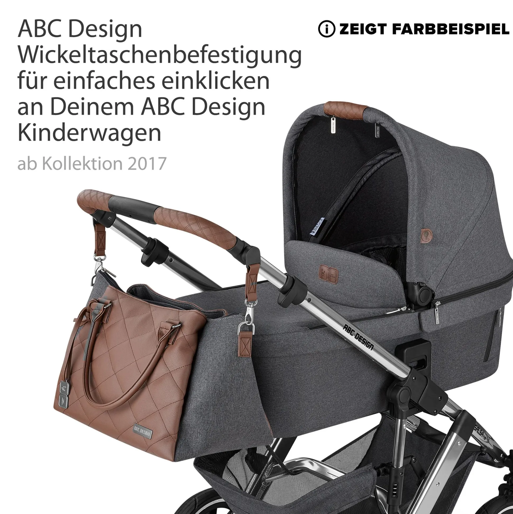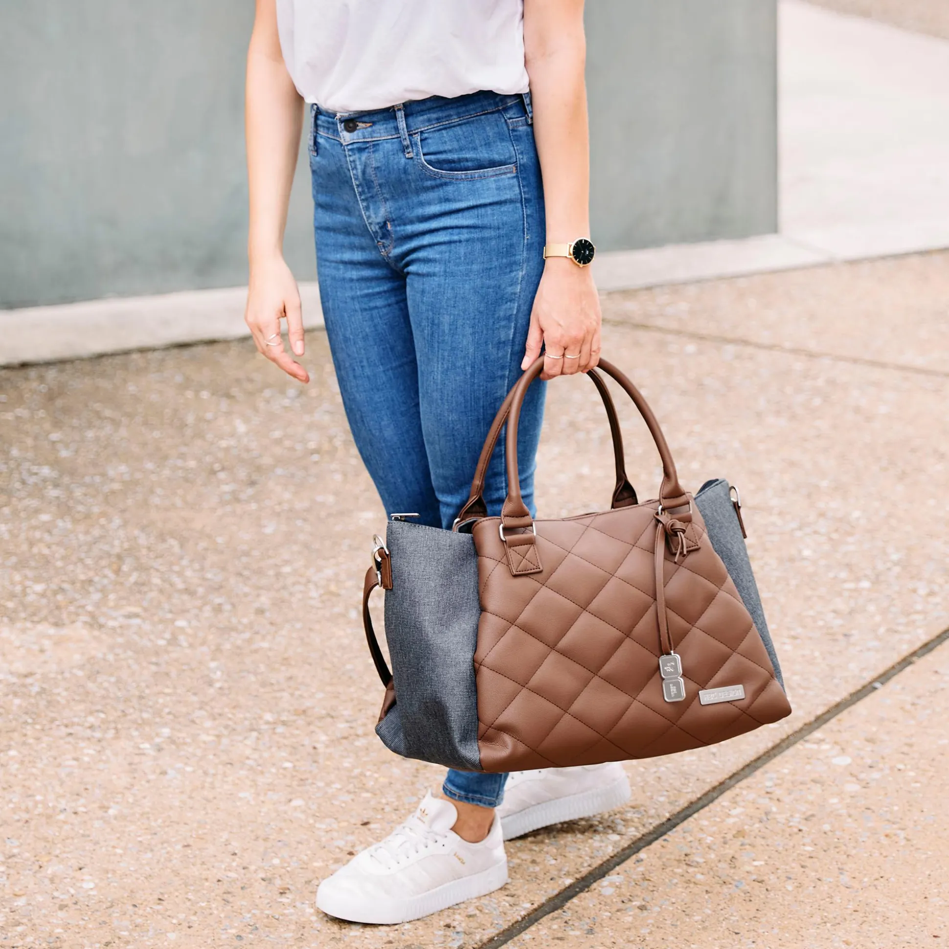 - 3 Tragevarianten: direkt am Kinderwagen über die integrierte Wickeltaschenbefestigung, als lässige Umhängetasche mit Schultergurt in Lederoptik oder als schicke Handtasche