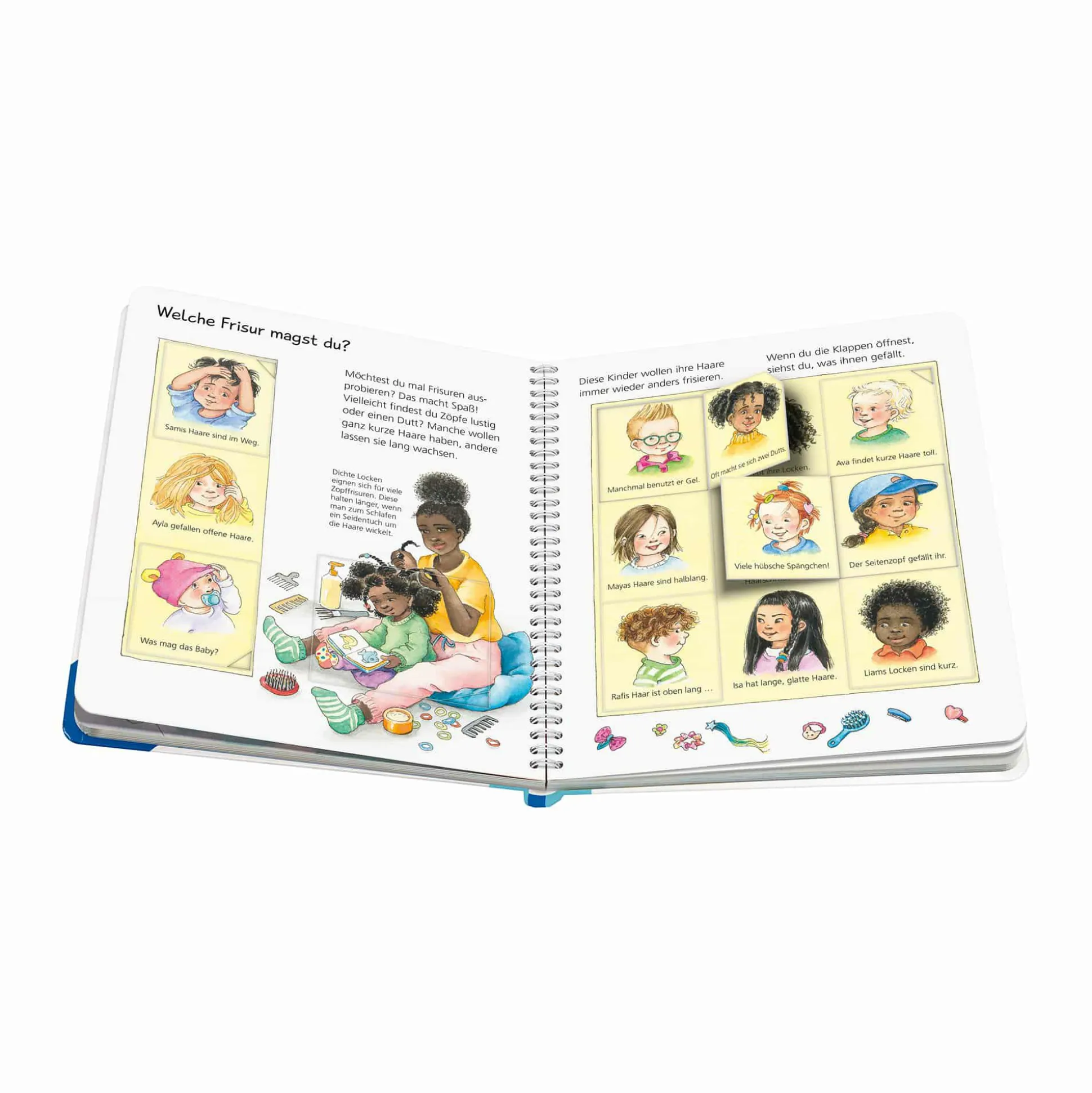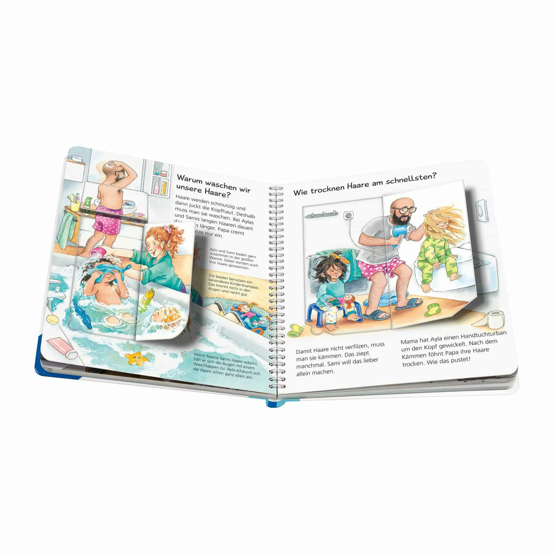 Das Buch „Wieso? Weshalb? Warum? junior, Band 79: Kämmen, schneiden, Haare waschen“ von Ravensburger vermittelt deinem kleinen Nachwuchs mithilfe von Klappen erstes Wissen über Haare und Haarpflege.