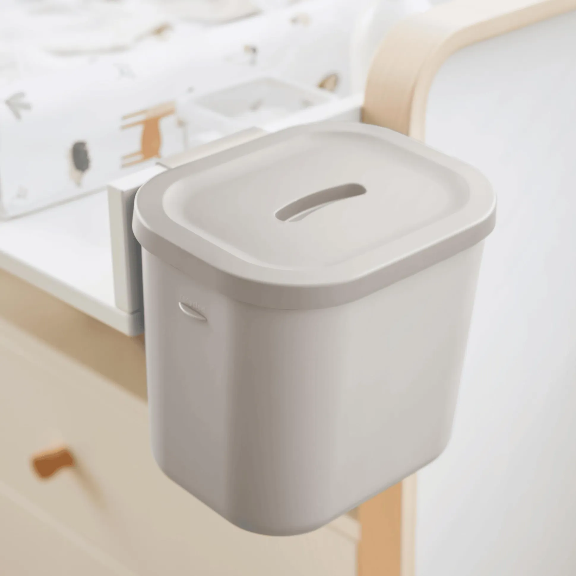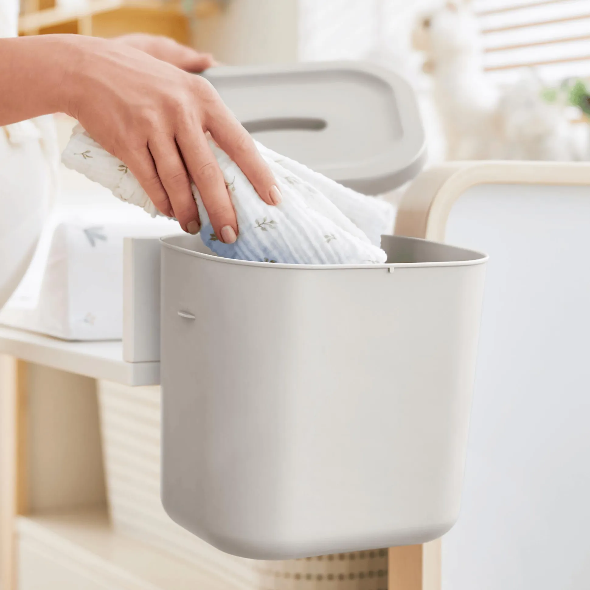 Ein besonderes Highlight ist die Möglichkeit, den Eimer direkt am Wickeltischrand, an Türen oder Schubladen einzuhängen – so ist er immer griffbereit und nimmt keinen zusätzlichen Platz ein. Seine kippsichere Bauweise und die platzierte Höhe sorgen dafür, dass er außerhalb der Reichweite deines Babys bleibt. Zudem ist er einfach zu reinigen, damit er jederzeit hygienisch einsatzbereit ist.