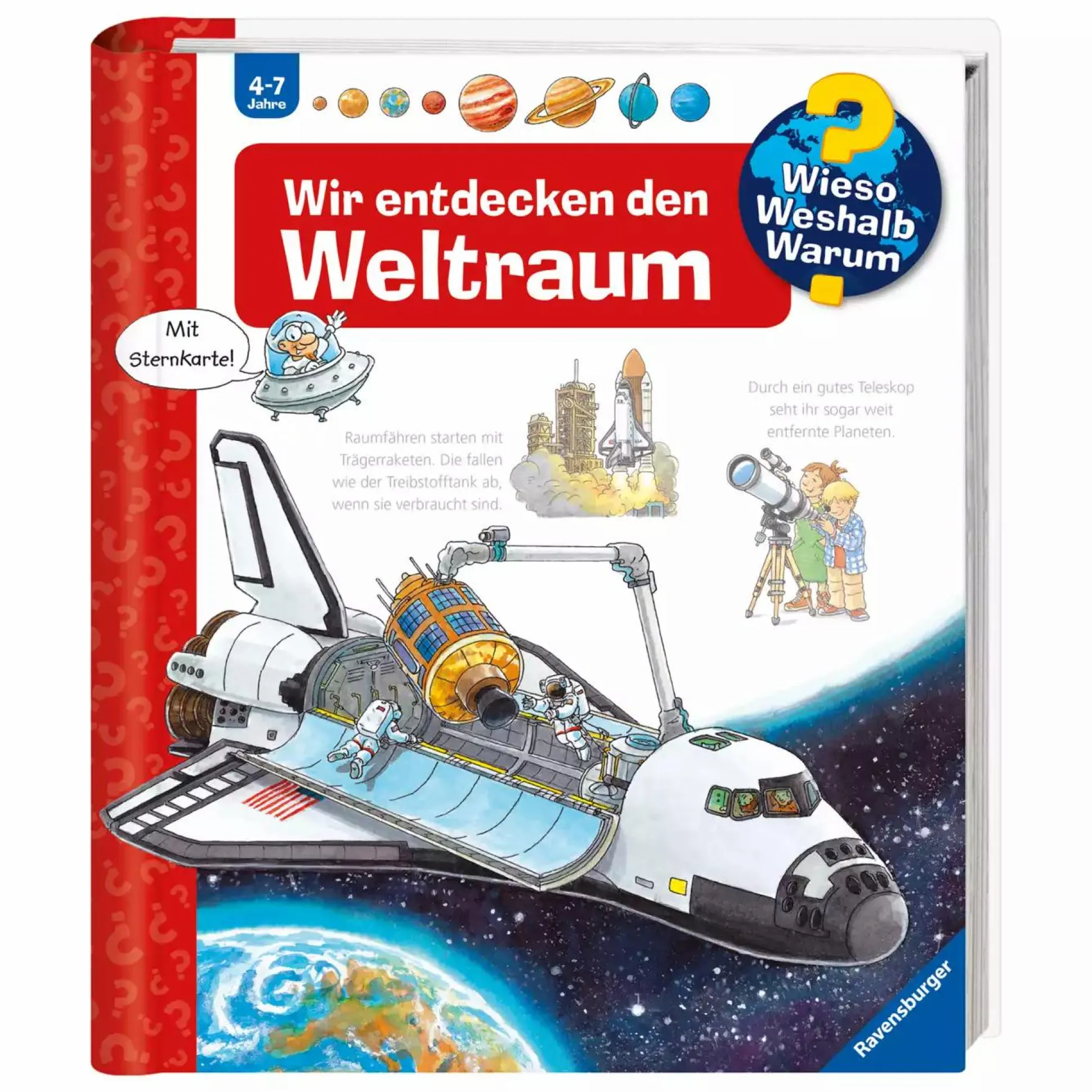 Das faszinierende Buch WWW Wir entdecken den Weltraum von Ravensburger beantwortet deinem Kind viele Fragen rund um den Weltraum mit kindgerechten Texten und Bildern. Ob da oben wohl noch jemand wohnt? Gibt es den Mann im Mond? Wie sieht es in der internationalen Raumstation aus? Was muss ein Astronaut alles können? Wie geht man da oben aufs Klo und wie sieht unsere Erde von oben aus?