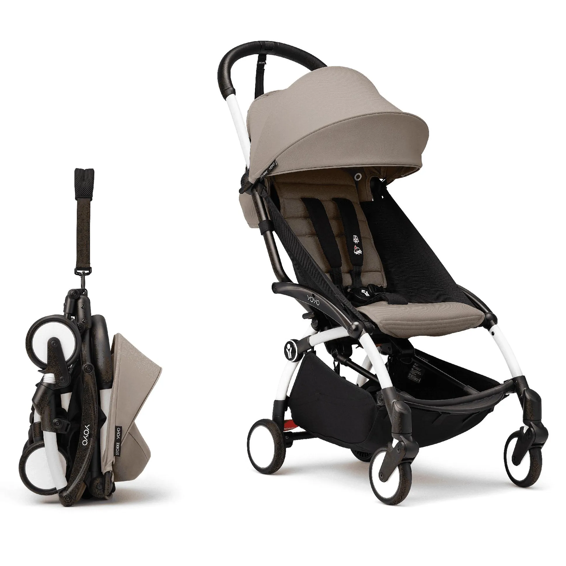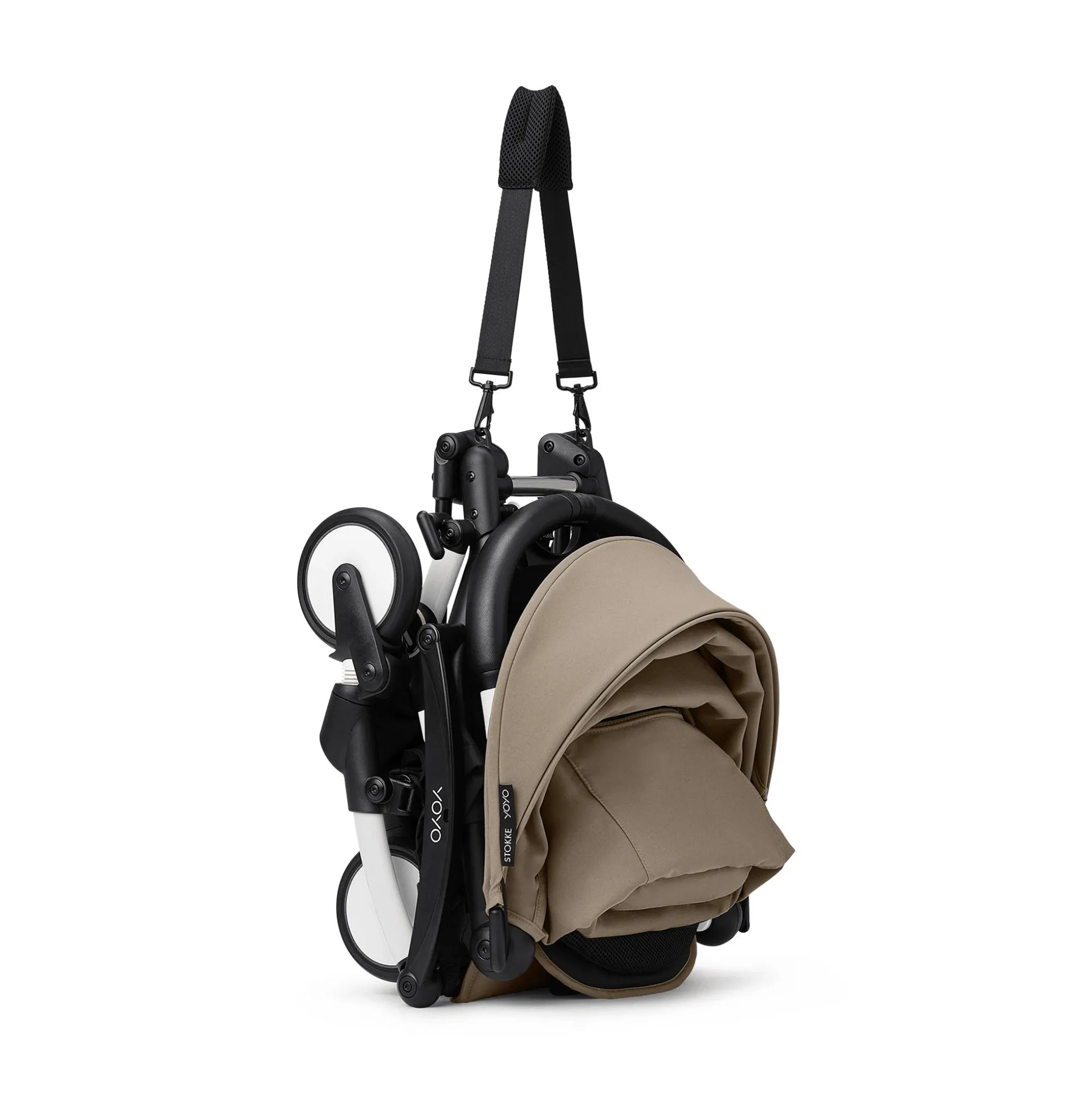 Das YOYO³ Gestell lässt sich kinderleicht entfalten und zusammenfalten, kann über der Schulter getragen werden, passt überall zwischen, ist leicht zu verstauen und kann als Handgepäck im Flugzeug mitgenommen werden (sowohl in der 0+ als auch in der 6+ Version – die Standards für Handgepäck können je nach Fluggesellschaft variieren.).
