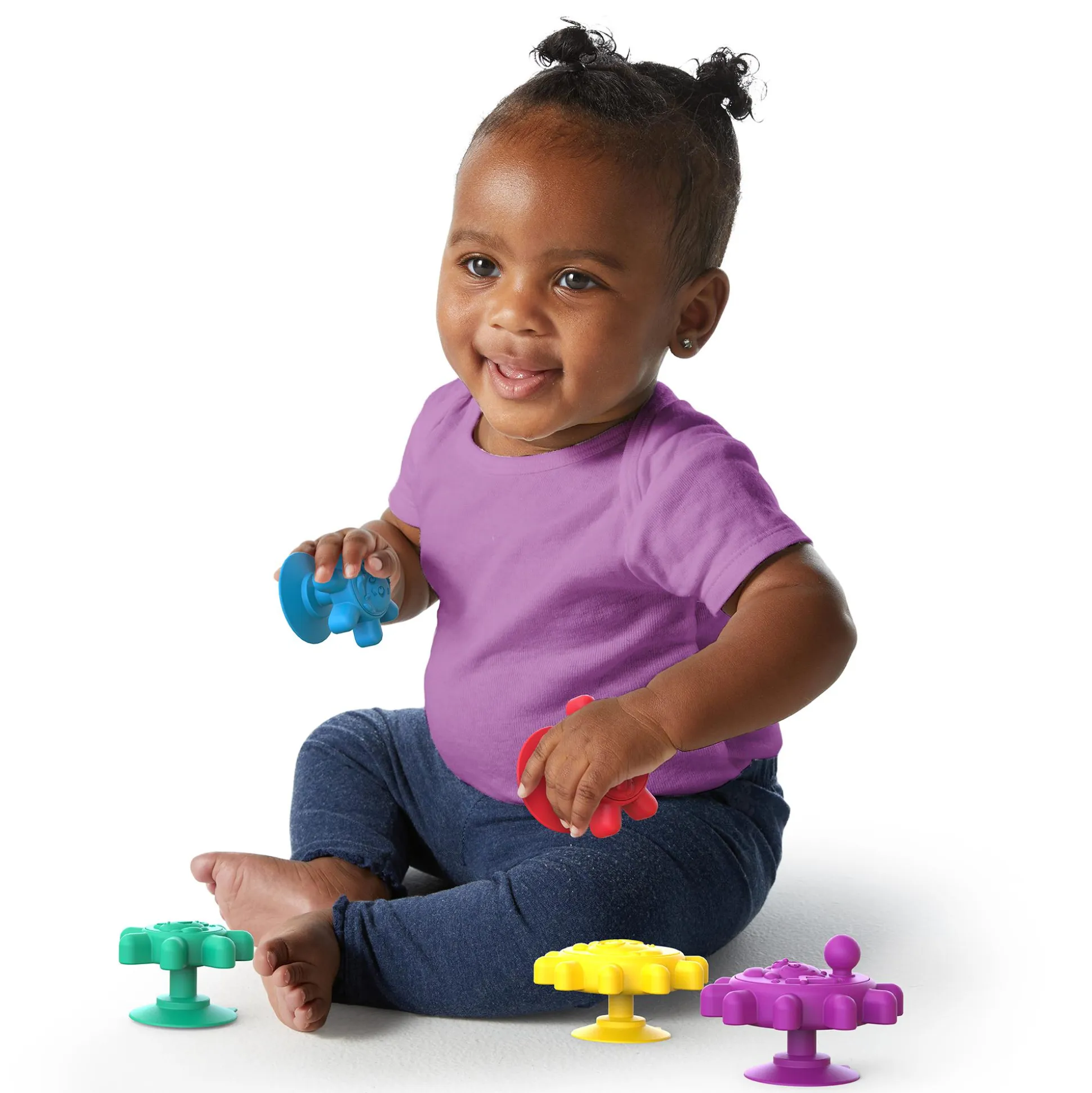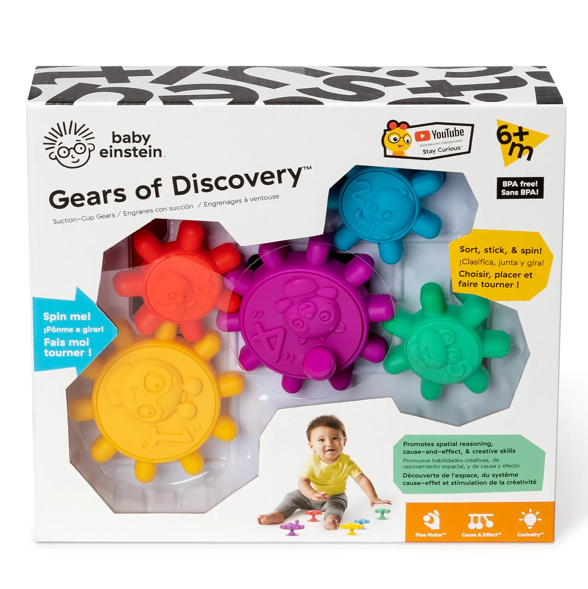 Welches Spielzeug kann dein Kind sortieren, stapeln, drehen und überallhin kleben, von der Badewanne bis zum Kühlschrank? Die Antwort: die Zahnräder mit Saugnäpfen „Gears of Discovery™“ von Baby Einstein™!