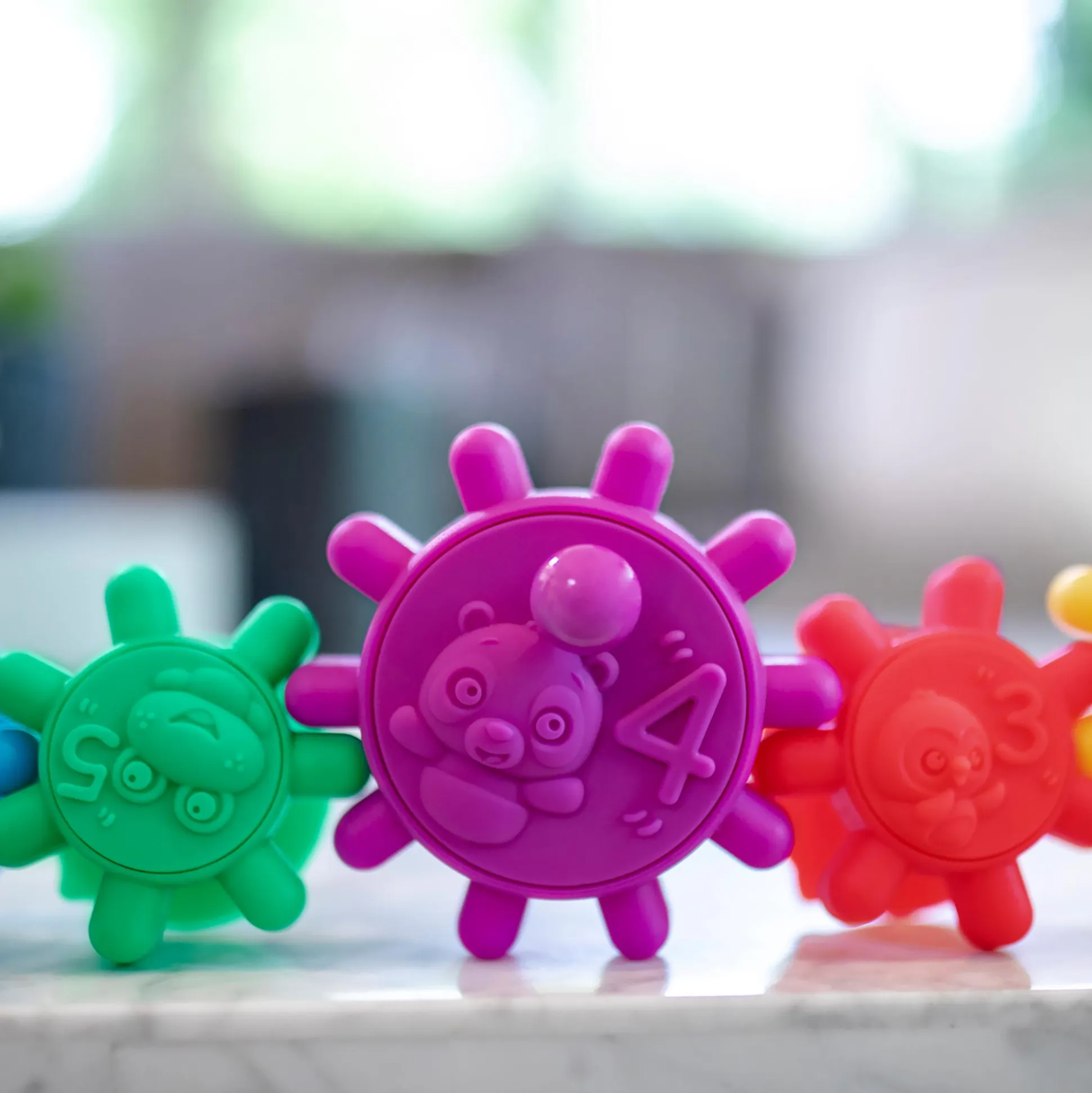 Dieses Sensorik- und Badespielzeugset ist ein großartiges Hilfsmittel für Eltern, die ihren Säuglingen und Kleinkindern helfen möchten, Zahlen, Tiere und Farben zu entdecken. Die sich drehenden Zahnräder fördern außerdem die Feinmotorik, das räumliche Vorstellungsvermögen und das Ursache-Wirkungs-Konzept. Jedes Mal, wenn das Baby mit den Zahnrädern spielt, wird es neue Kreationen (und neue Fähigkeiten) entwickeln! Da alle 5 farbenfrohen Zahnräder mit Saugnäpfen versehen sind, die an Fliesen und den meisten anderen glatten Oberflächen haften, eignen sie sich perfekt zum Baden, Spielen auf dem Boden oder zum Mitnehmen in der Wickeltasche.