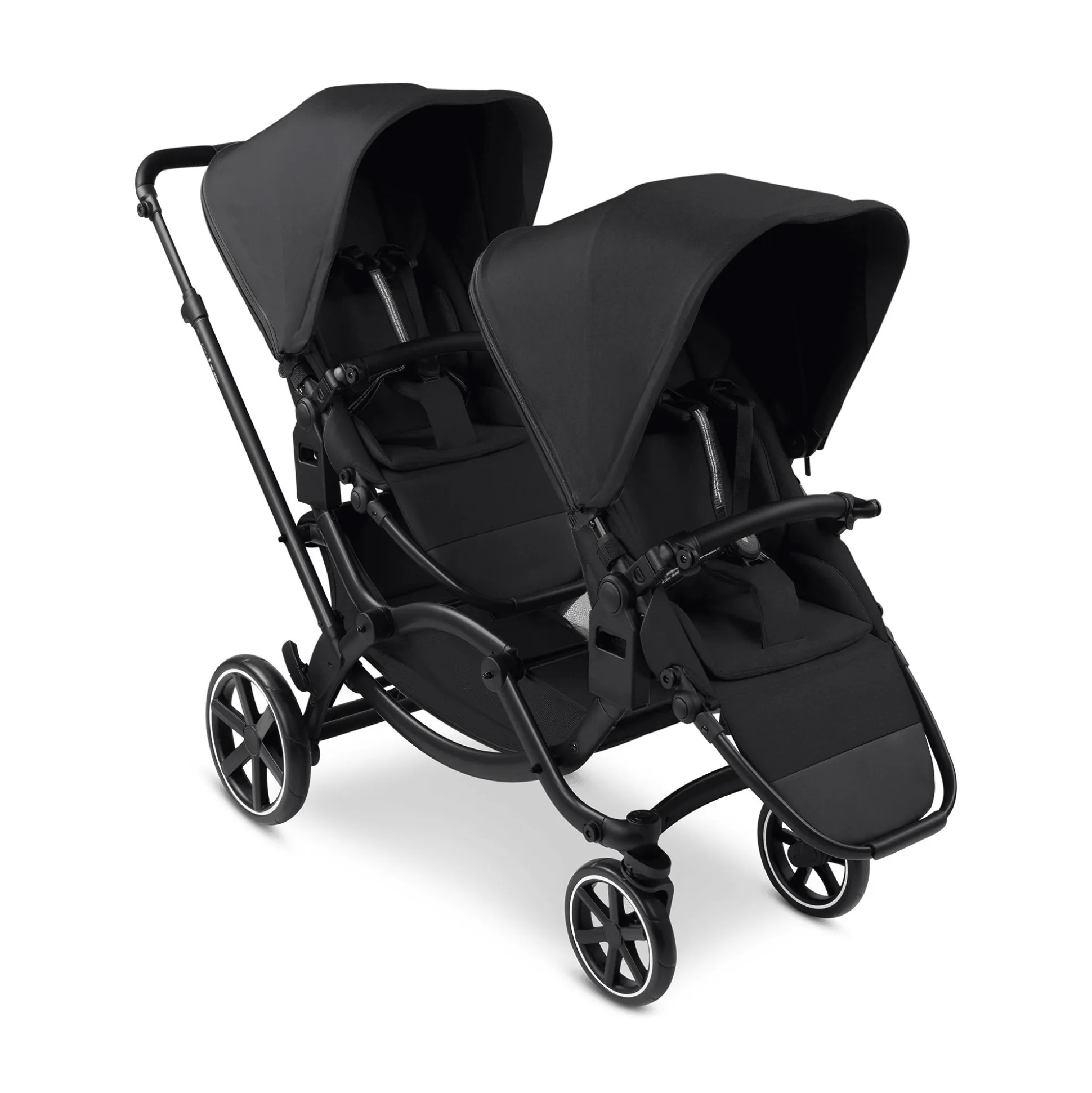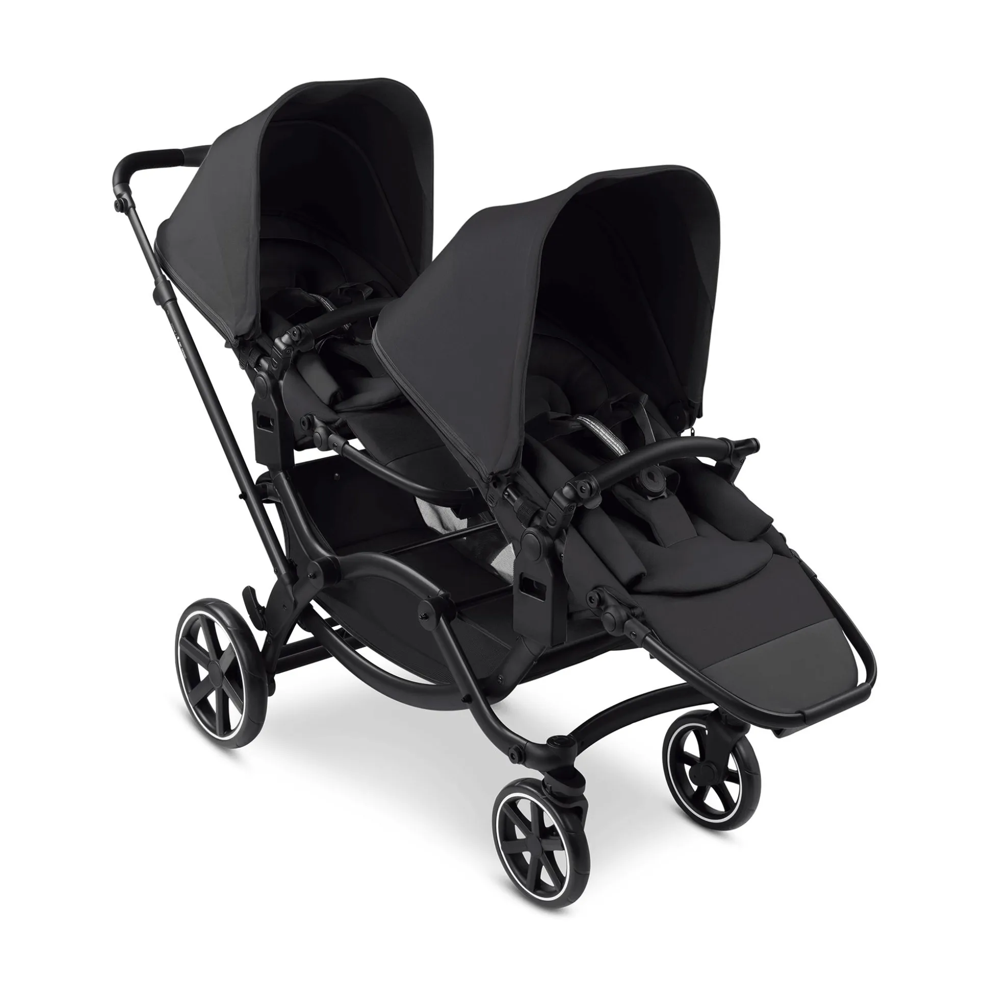Dabei kann eure Tour über asphaltierte Wege, über Kopfsteinpflaster oder über Park- und Schotterwege gehen: Die leichten, schwenkbaren Airless-Räder mit Einzelrad-Federung und Zusatzfederung an der Hinterachse sorgen für eine ruhige Fahrt. Durch den schmalen Radstand passt der Geschwister-Kinderwagen auch durch jede Engstelle. Er ist nicht viel breiter als ein Einzelkinderwagen. So kann man ihn auch wie einen Einzelkinderwagen kompakt zusammenfalten und ihn platzsparend im Kofferraum verstauen.