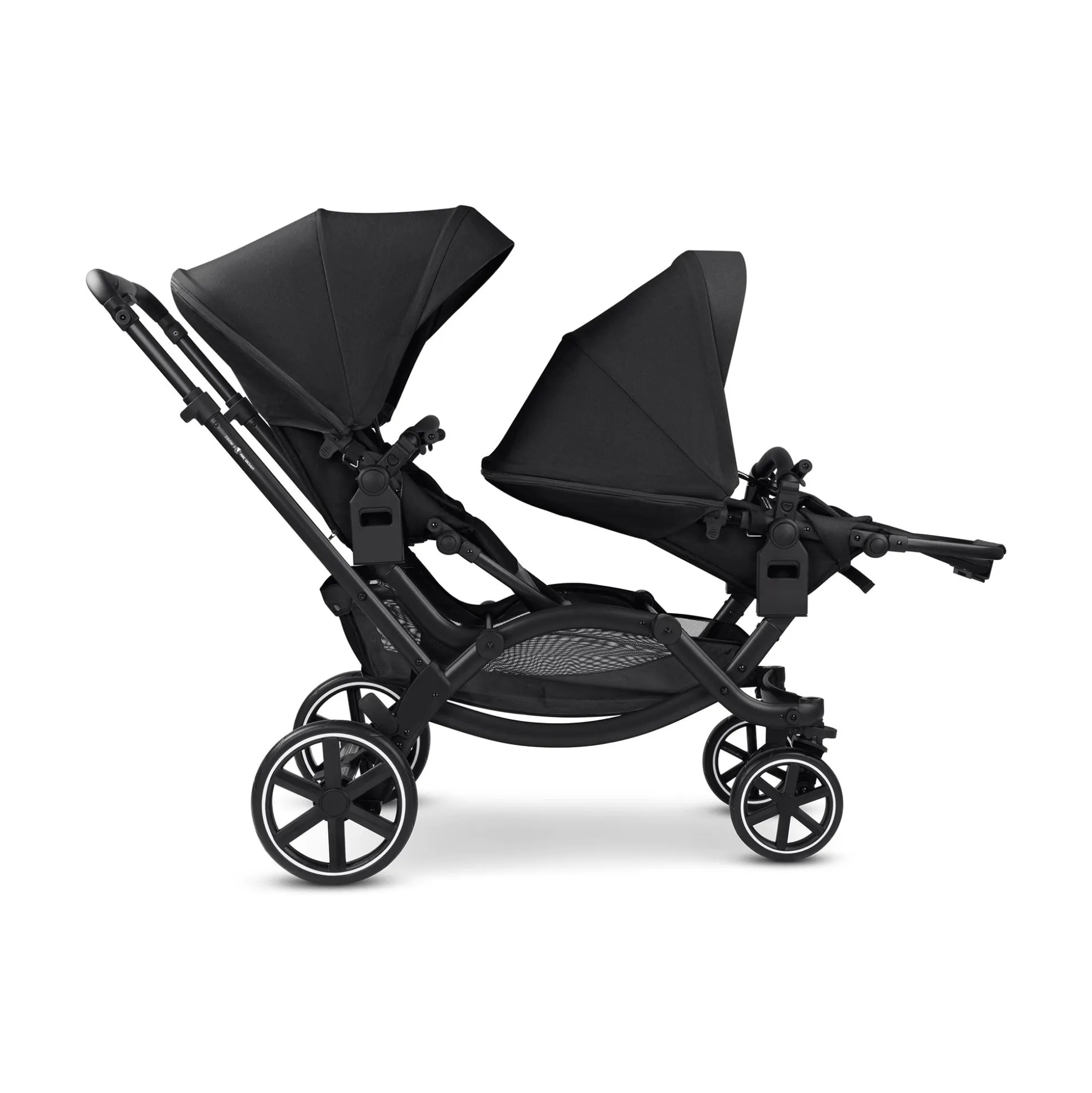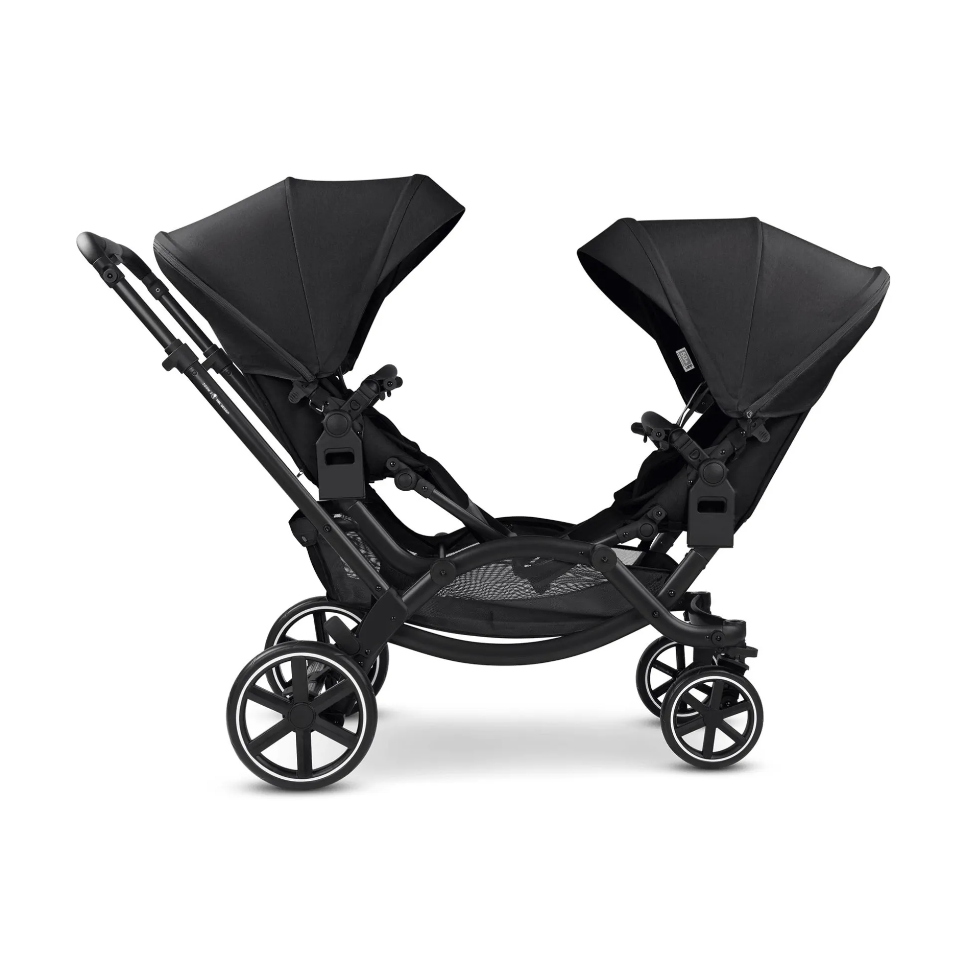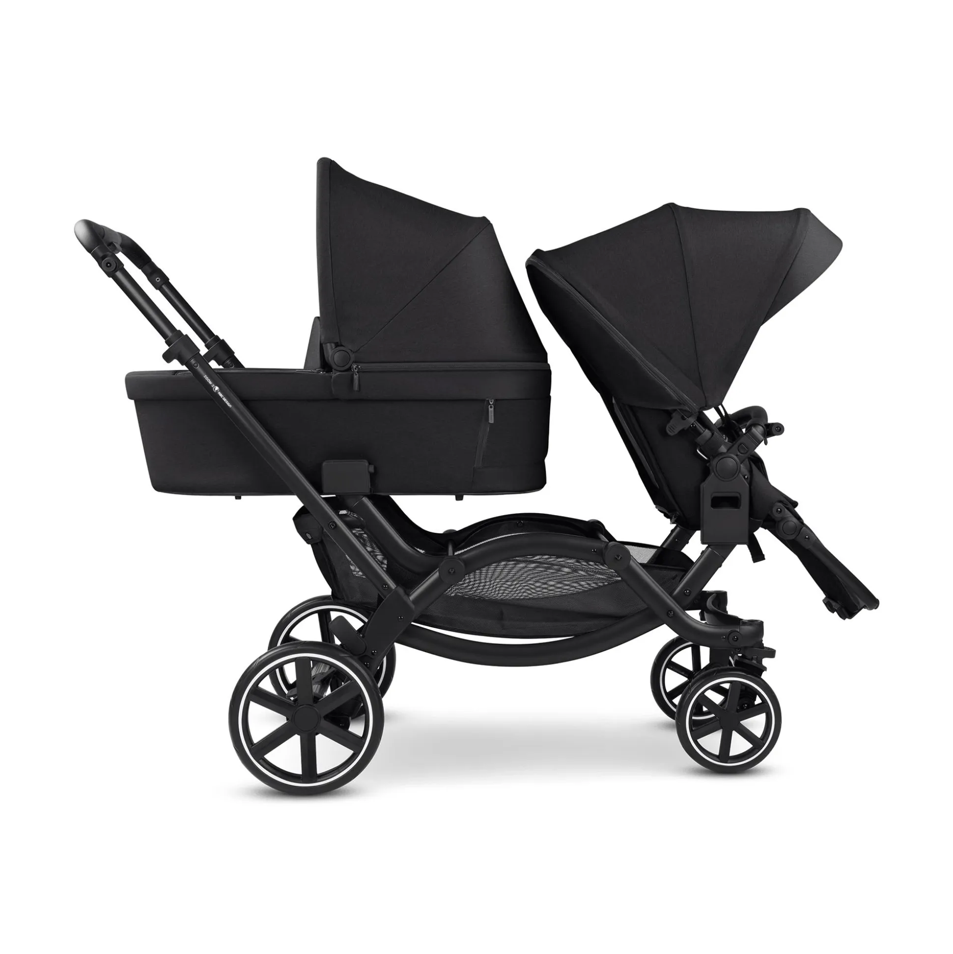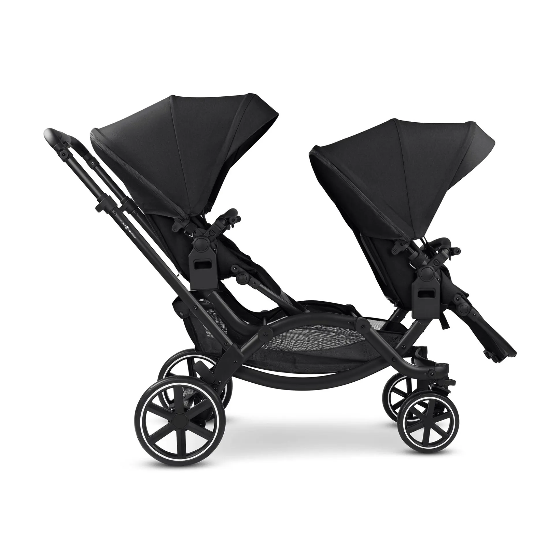 Ein Kinderwagen, zwei Sitze und uneingeschränkter Komfort: Deine beiden Kinder nehmen hintereinander Platz. Damit beide eine optimale Sitz- oder Liegeposition einnehmen können, befinden sich beide Sitze auf gleicher Ebene. Dabei kann der Wagen bereits ab der Geburt genutzt werden. Durch die Komfort-Sitzeinlage mit 3D-Seitenflügeln, Kopfstütze und Keilkissen wird eine gesunde Haltung und flache Liegeposition ermöglicht. Für einen sicheren Halt in dem Zoom 2 sorgt der HappyBelt® 5-Punkt-Gurt. Dabei erleichtern die abstehenden Schultergurte und der Magnetverschluss des Gurtschlosses das Anschnallen und die stufenlose, von vorne zugängliche Gurtverstellung schafft den perfekten Sitz.